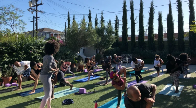 Participants fill the Purple Garden with mats and move through yoga sequences meant to strengthen and restore the body.